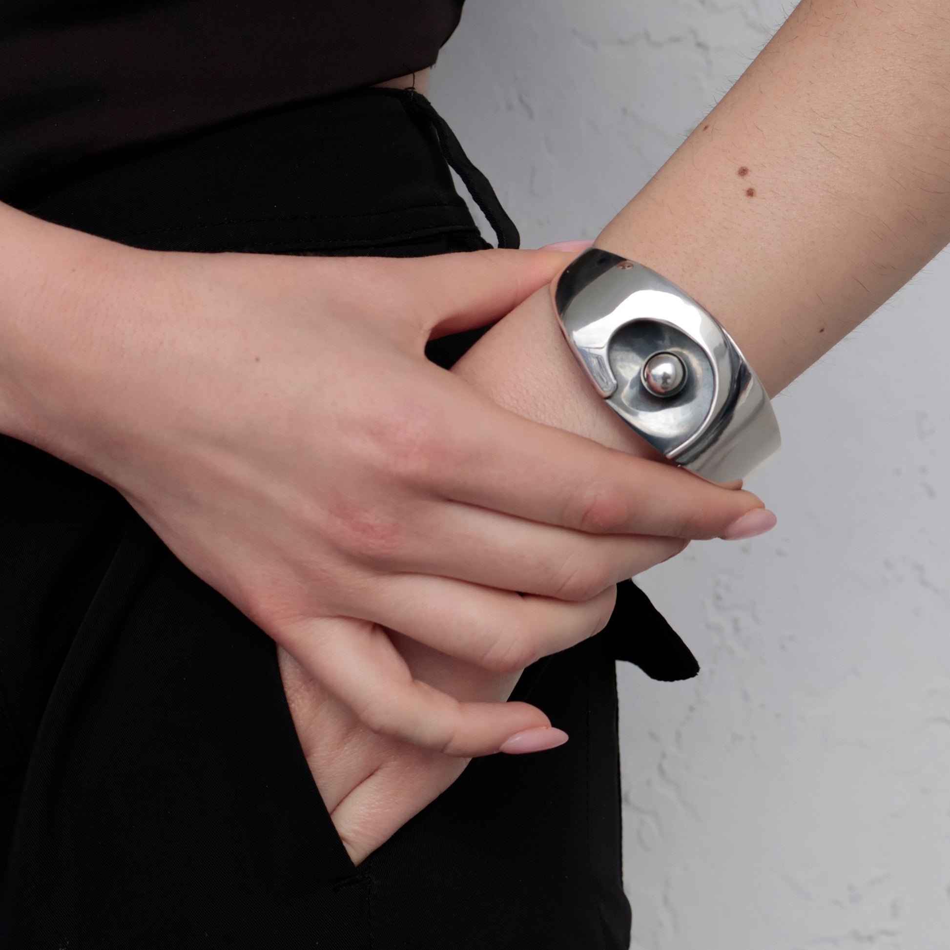The abstract eye is a handcrafted cuff bracelet designed by artist, Andrés Zagal. It features an abstract eye design made with the relevé and oxidized technique.
