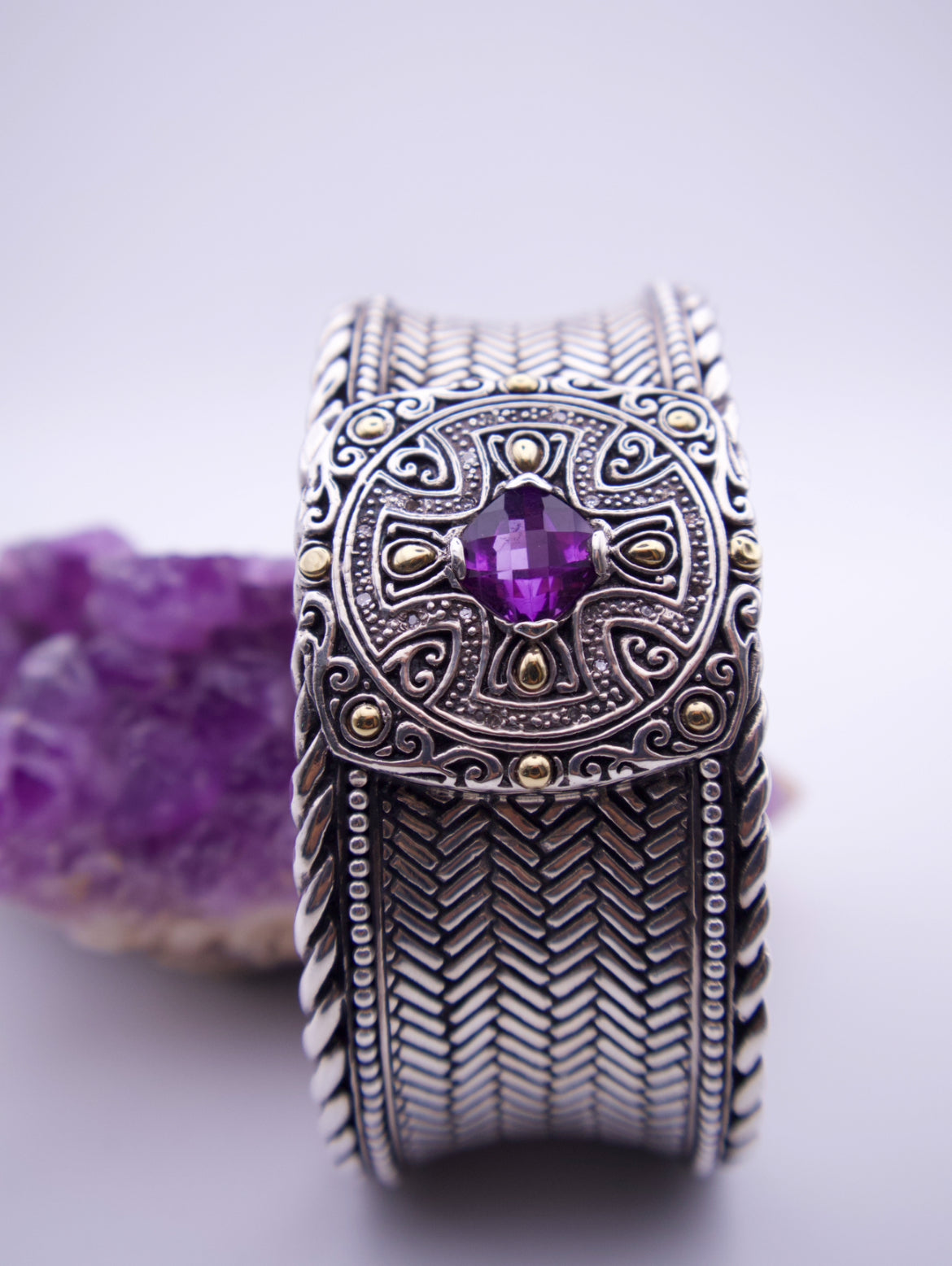 Hand woven cuff bracelet. Byzantine 10mm genuine amethyst set in byzantine design with 18k gold motifs. Unique piece.