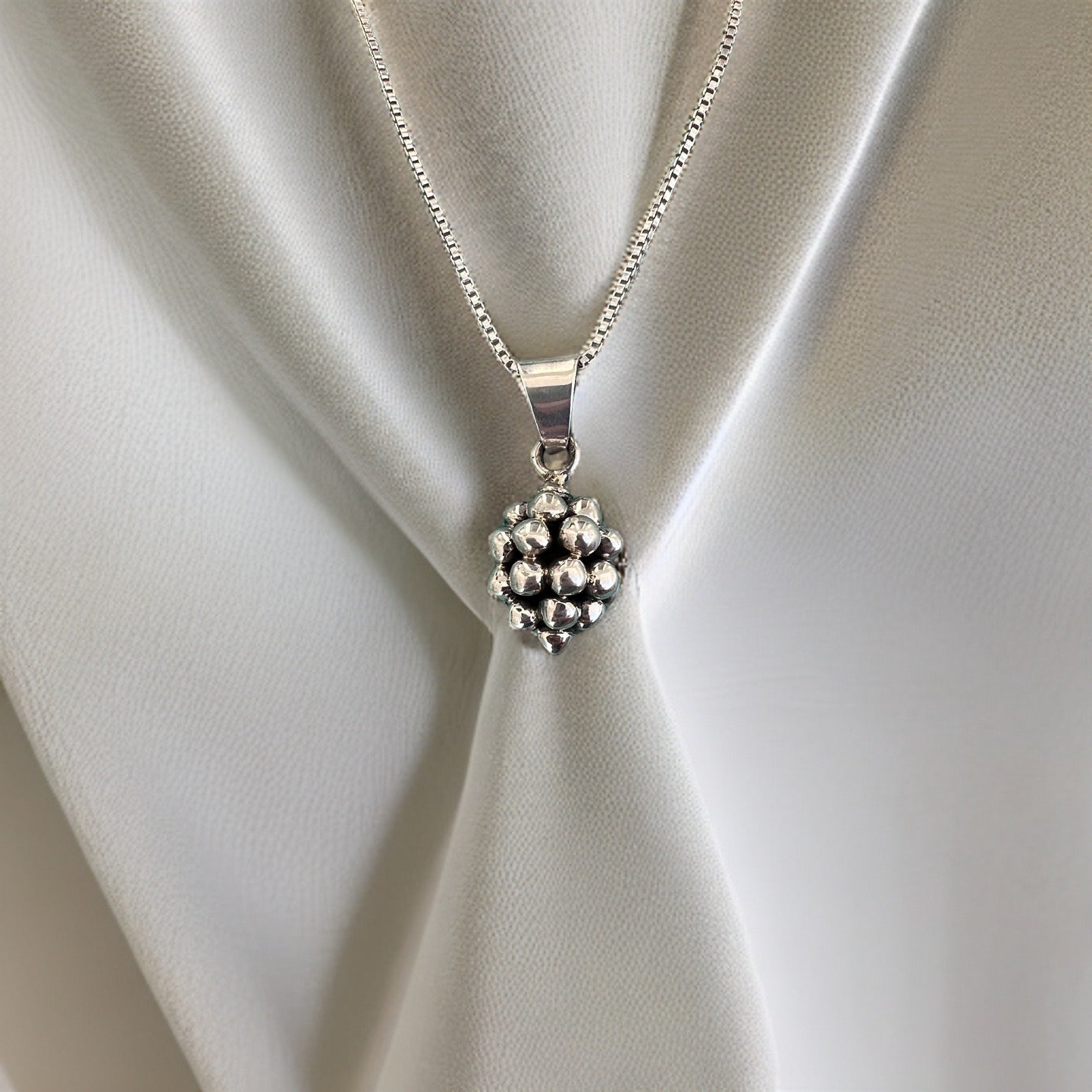Silver Street vintage design. The Blackberry pendant features small silver spheres meticulously soldered together to form a delicate blackberry. A unique piece that captures the charm of nature with refined craftsmanship.