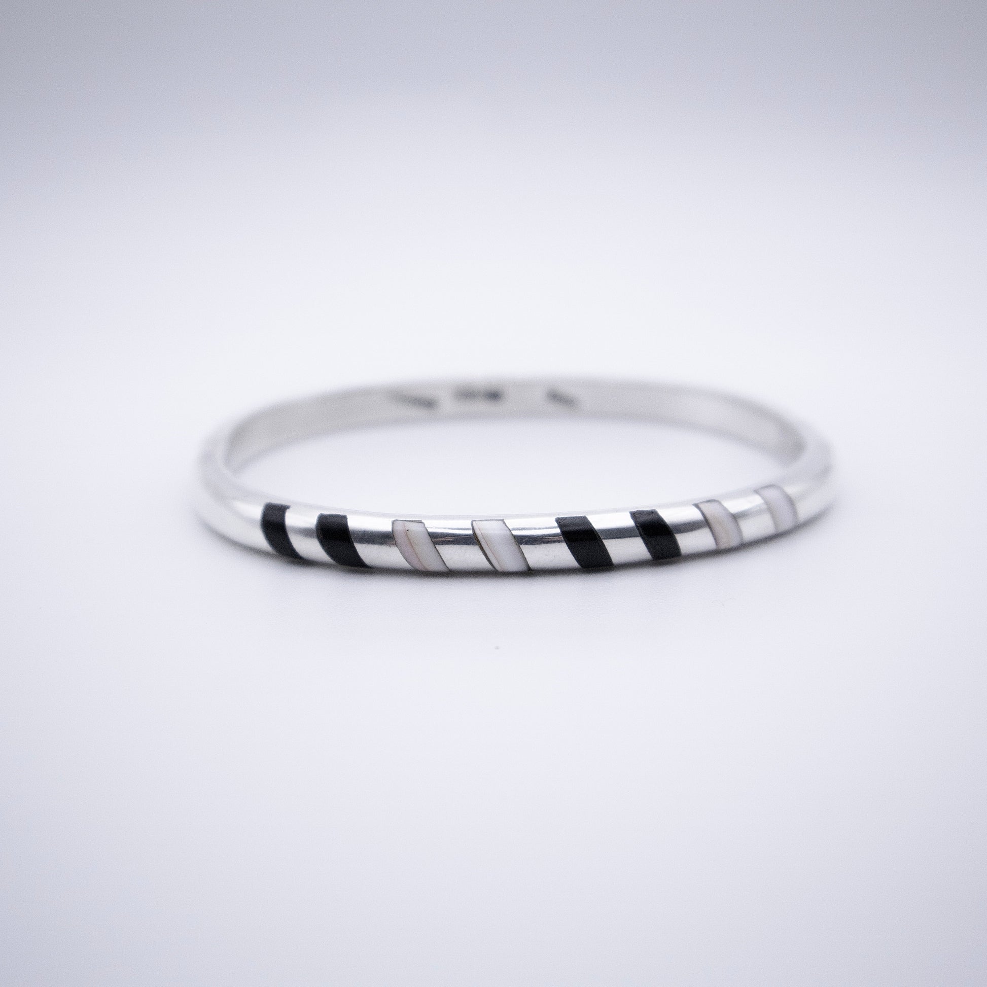 Description: Sterling Silver bangle bracelet inlaid with black onyx and conch shell. Oval shape with side opening.