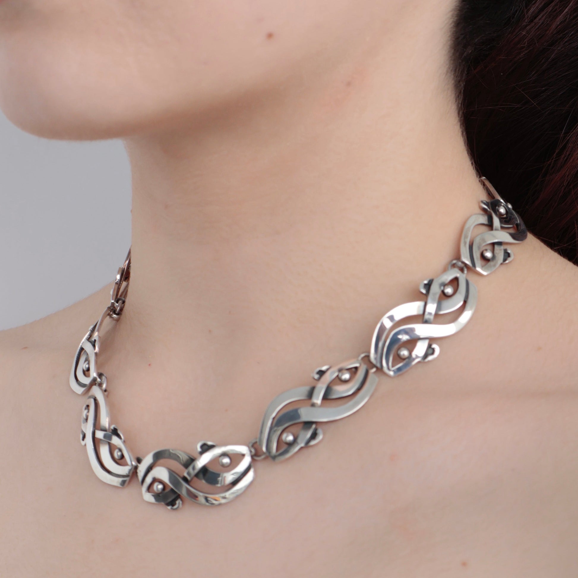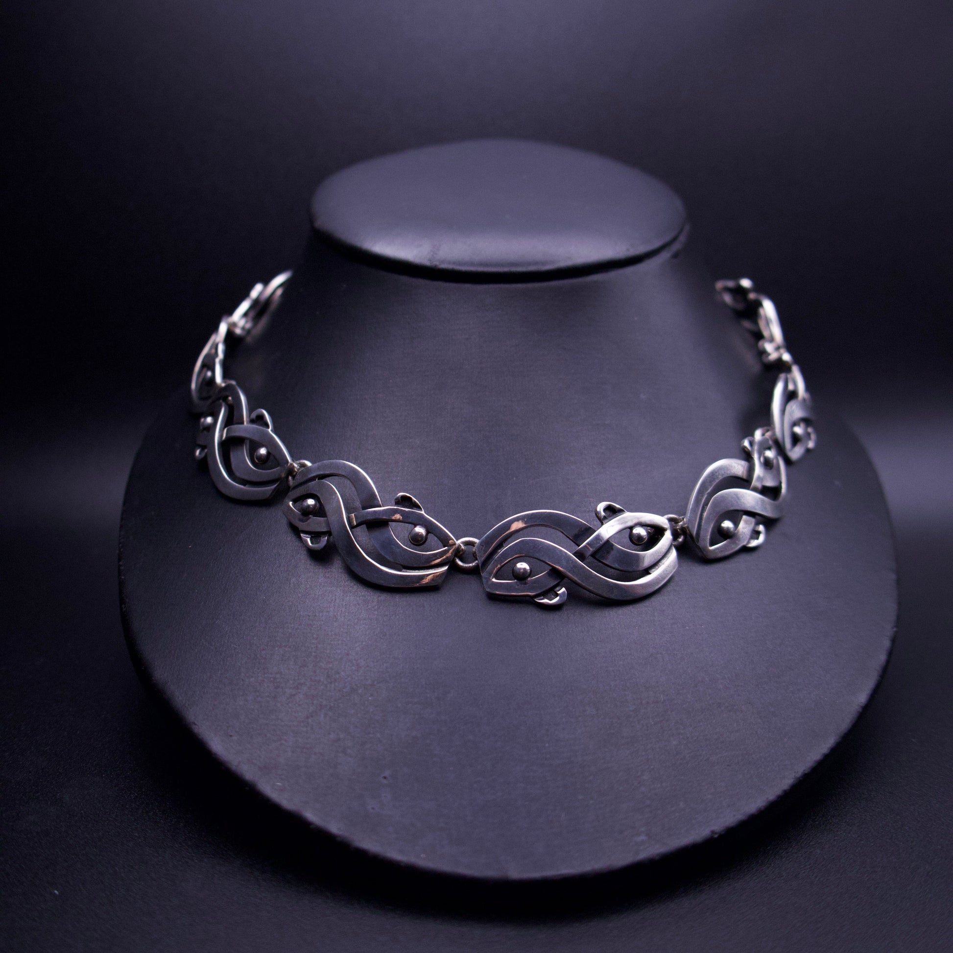 Sterling Silver Necklace by Jose Luis Flores. Vintage look from 1940's. Hallmarked JLF. Oxidized to show detail of handcrafted work.
