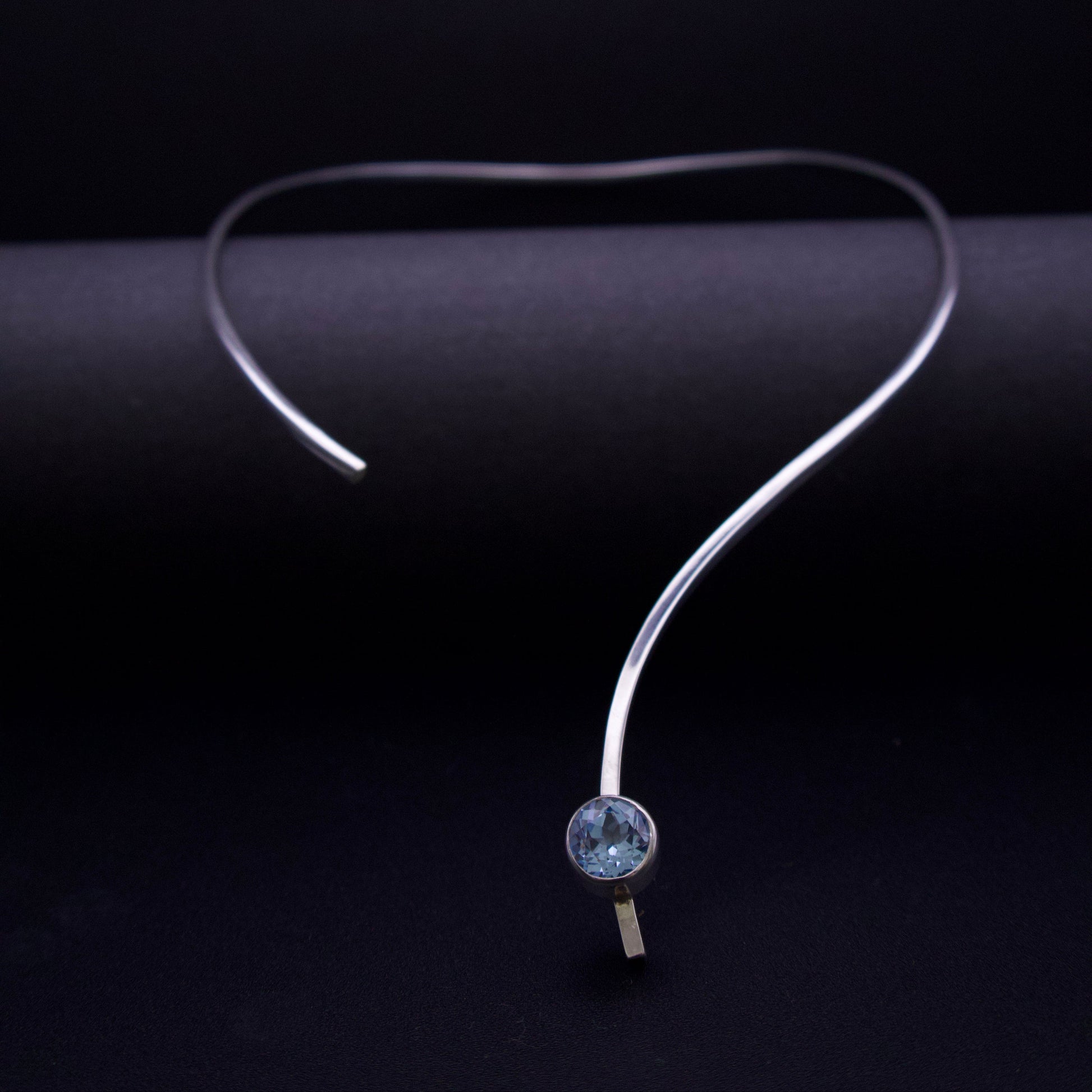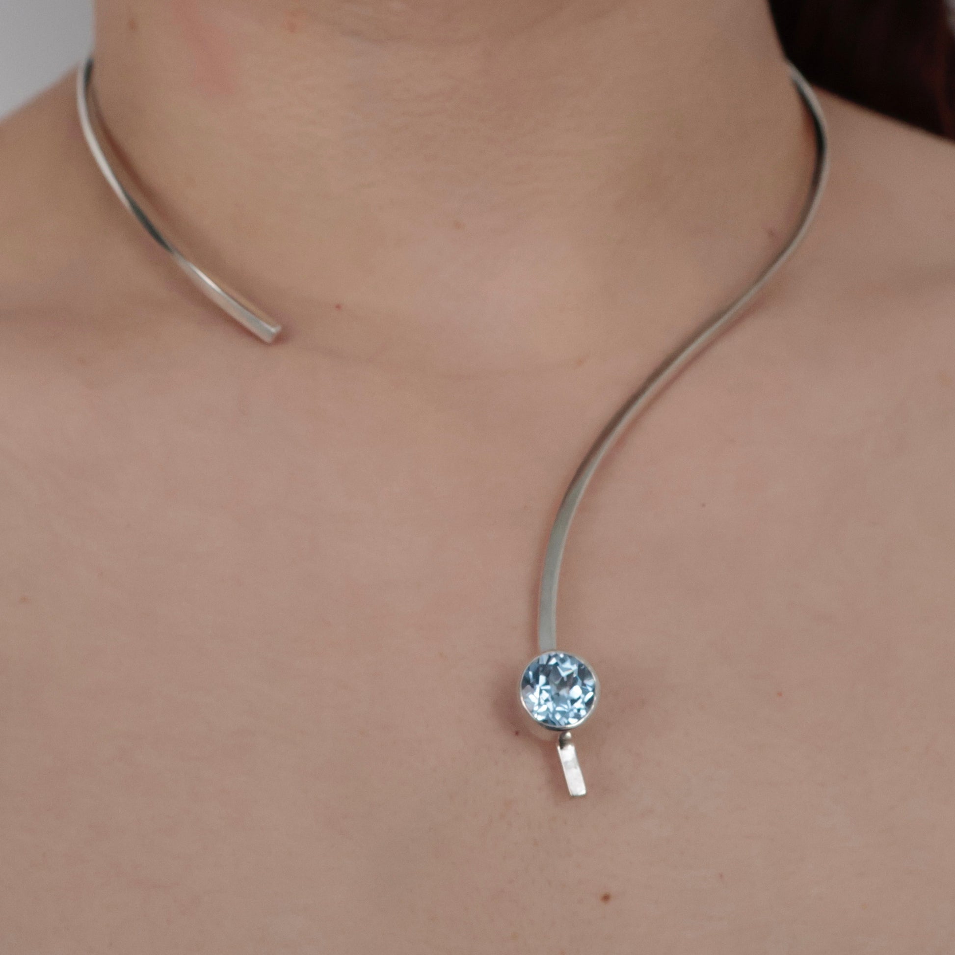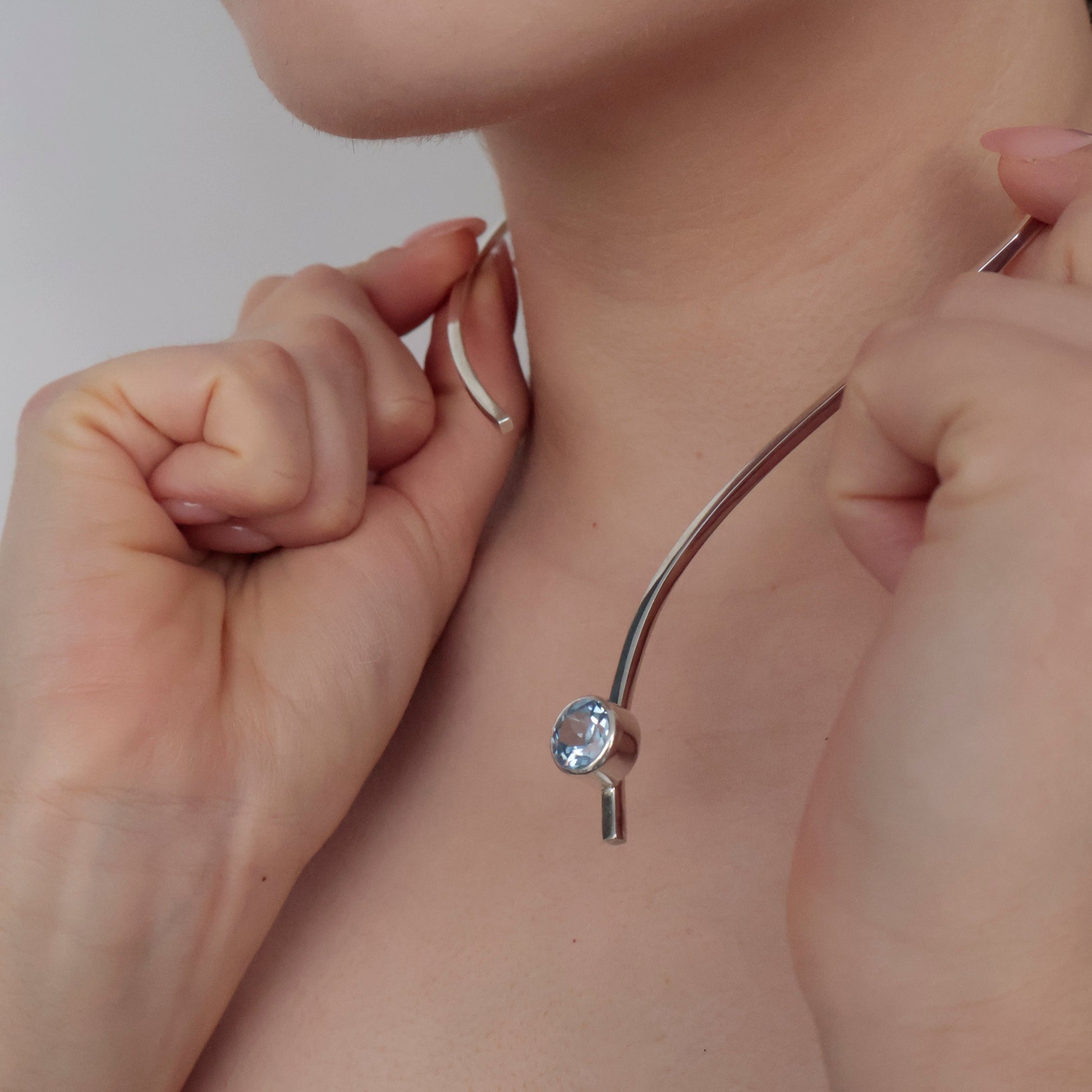 Designed by Andres Zagal for Silver Street, the Collage neck wire showcases an 11 mm Austrian cut cubic zirconia, offering a stunning sparkle. Tailored for a slender neck, this elegant piece adds a refined touch to any outfit. Light blue topaz. Sterling Silver.