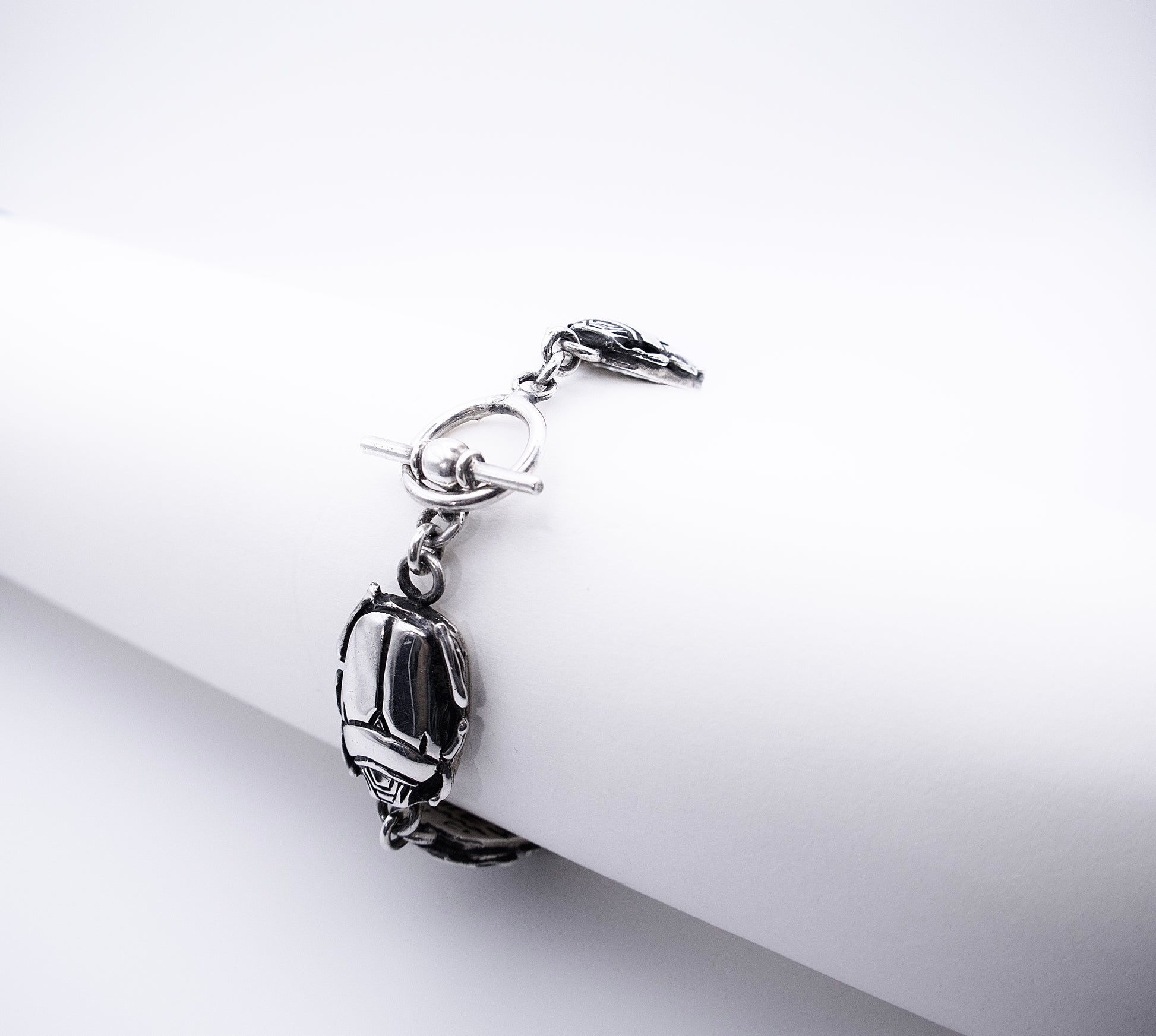 Description: oxidized silver, hieroglyphics on back each scarab.