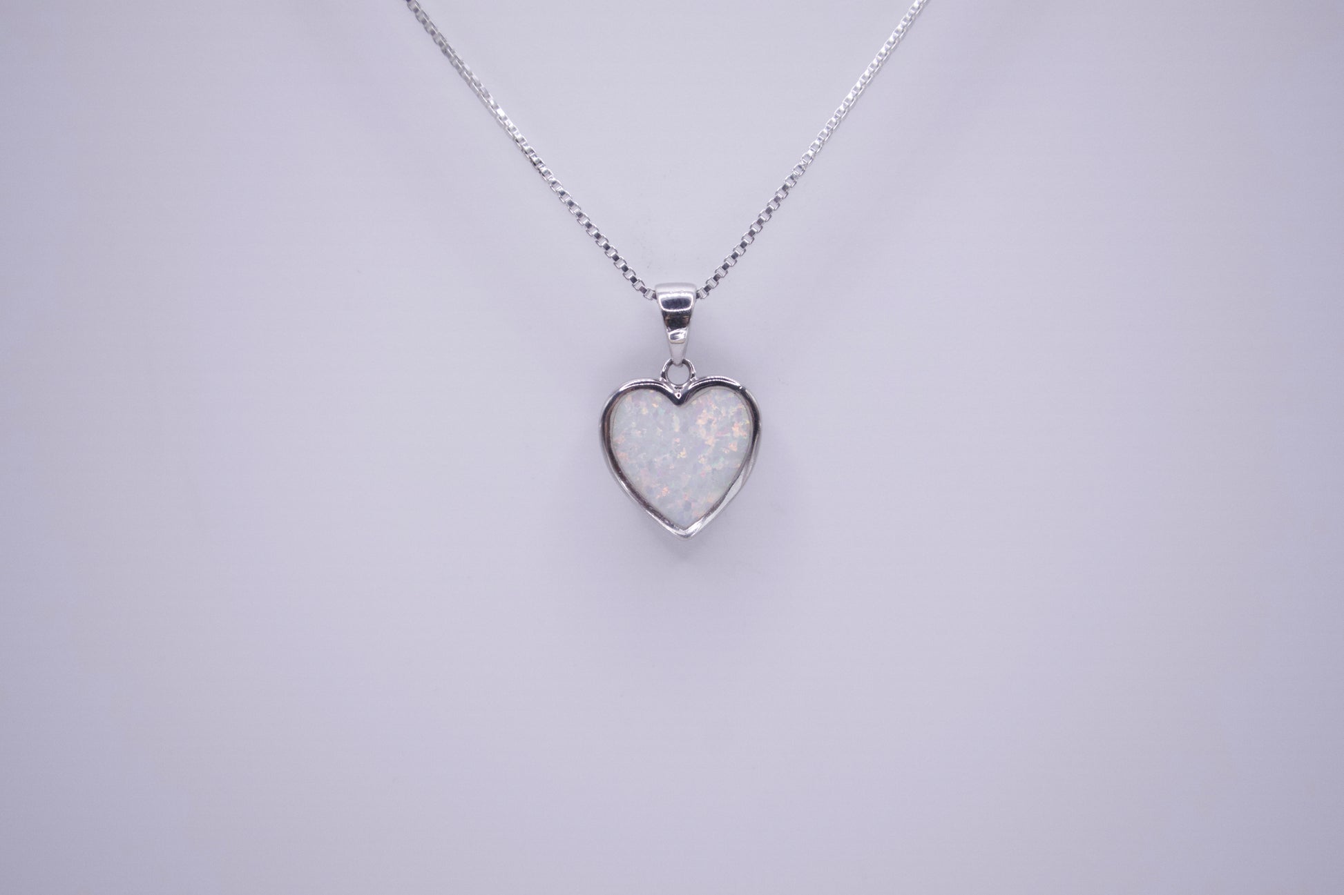 Sterling Silver heart set with a white lab created opal. Luminescent with tones of green and pink. fluorescent finish.