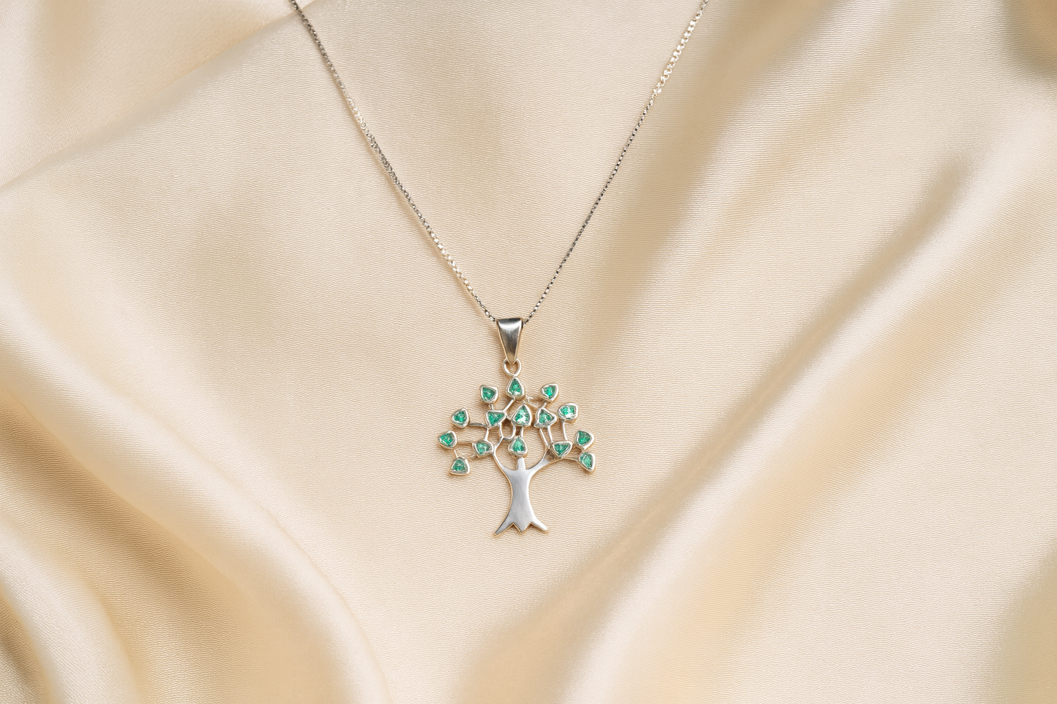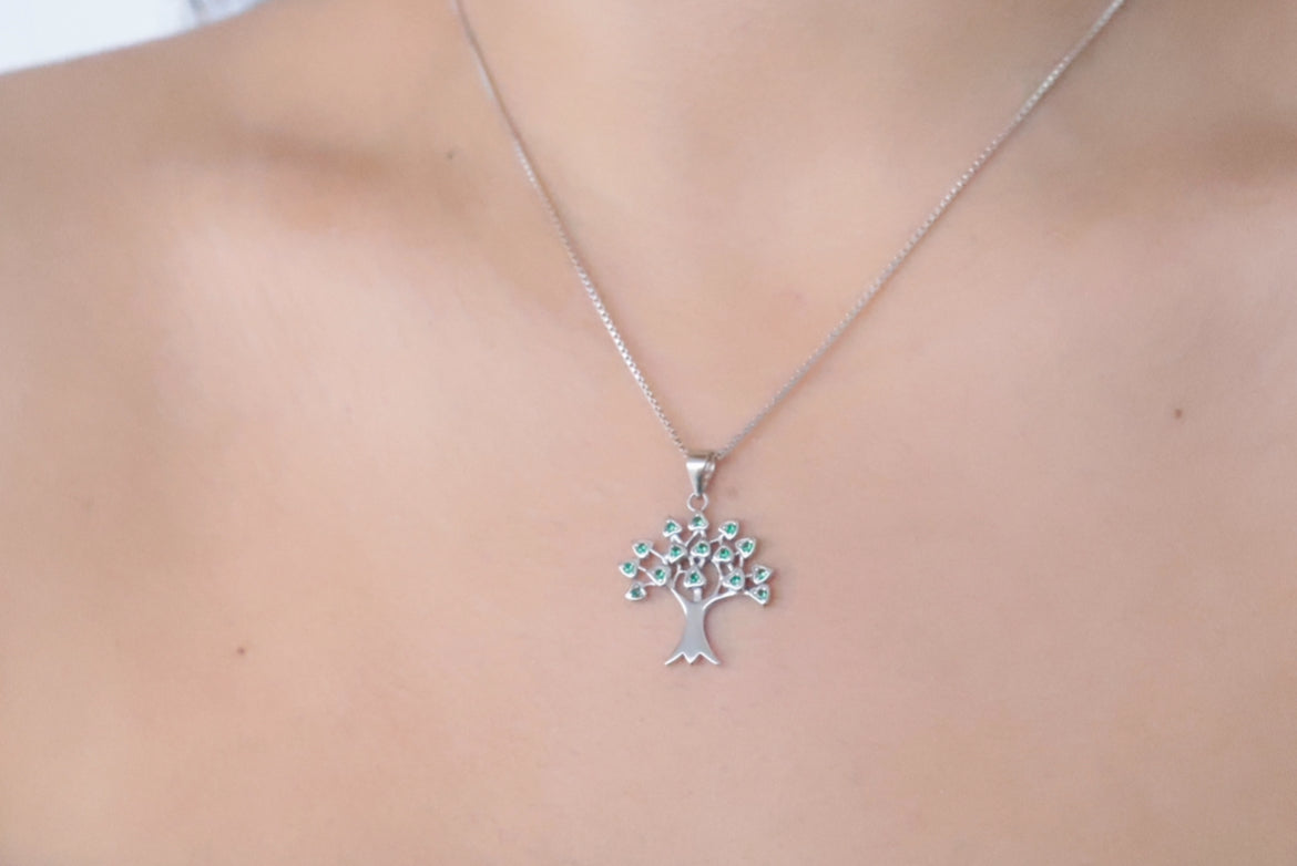 The Tree of Life pendant, adorned with green cubic zirconia stones, represents immortality and rebirth, this symbolic piece reflects the cycle of nature as trees shed their leaves in winter and bloom anew in spring. Material: Sterling silver, emerald green cubic zirconia.