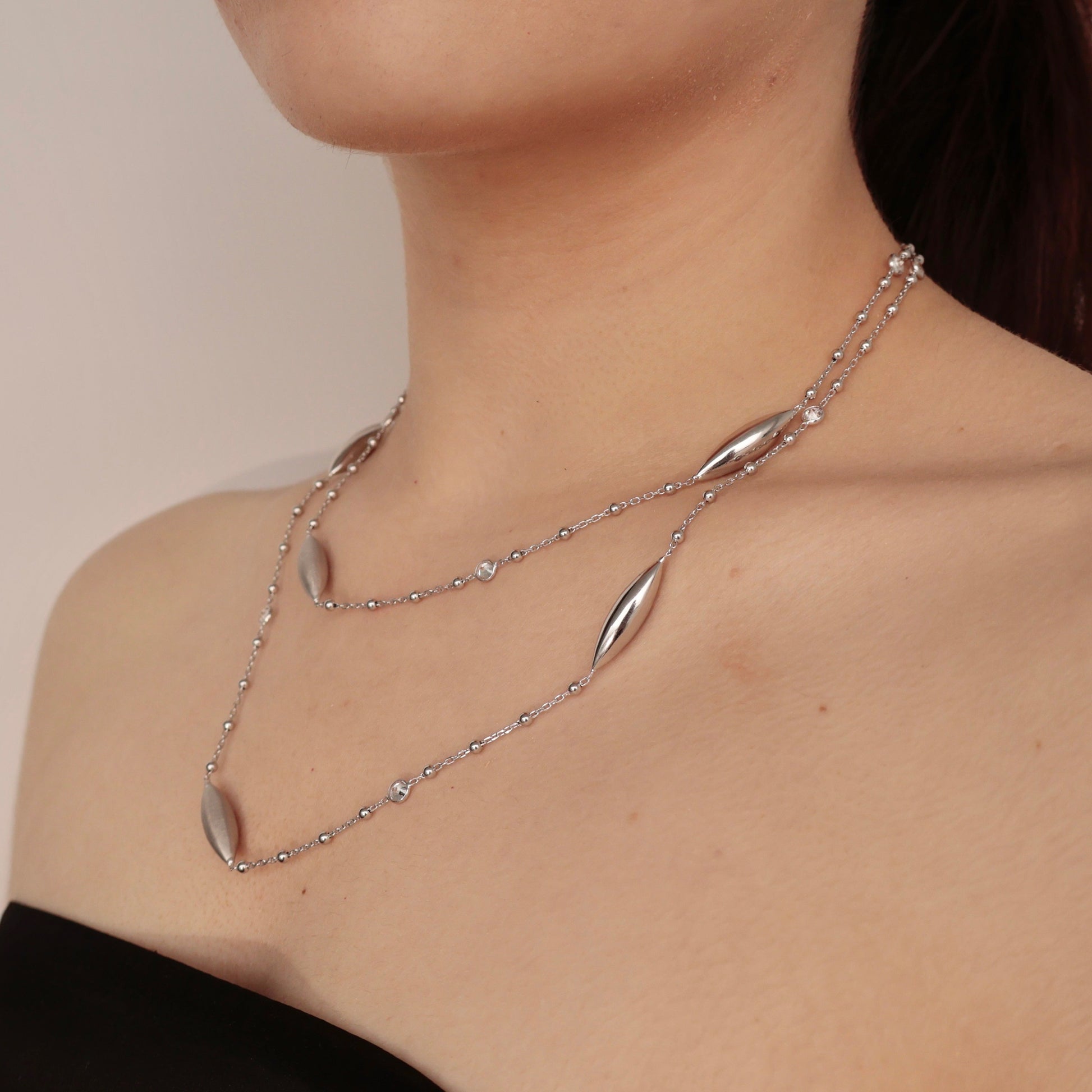 Sterling Silver chain with brushed and highly polished tubes and Cubic Zirconia. Can be worn long or doubled up. Sleek and Elegant.