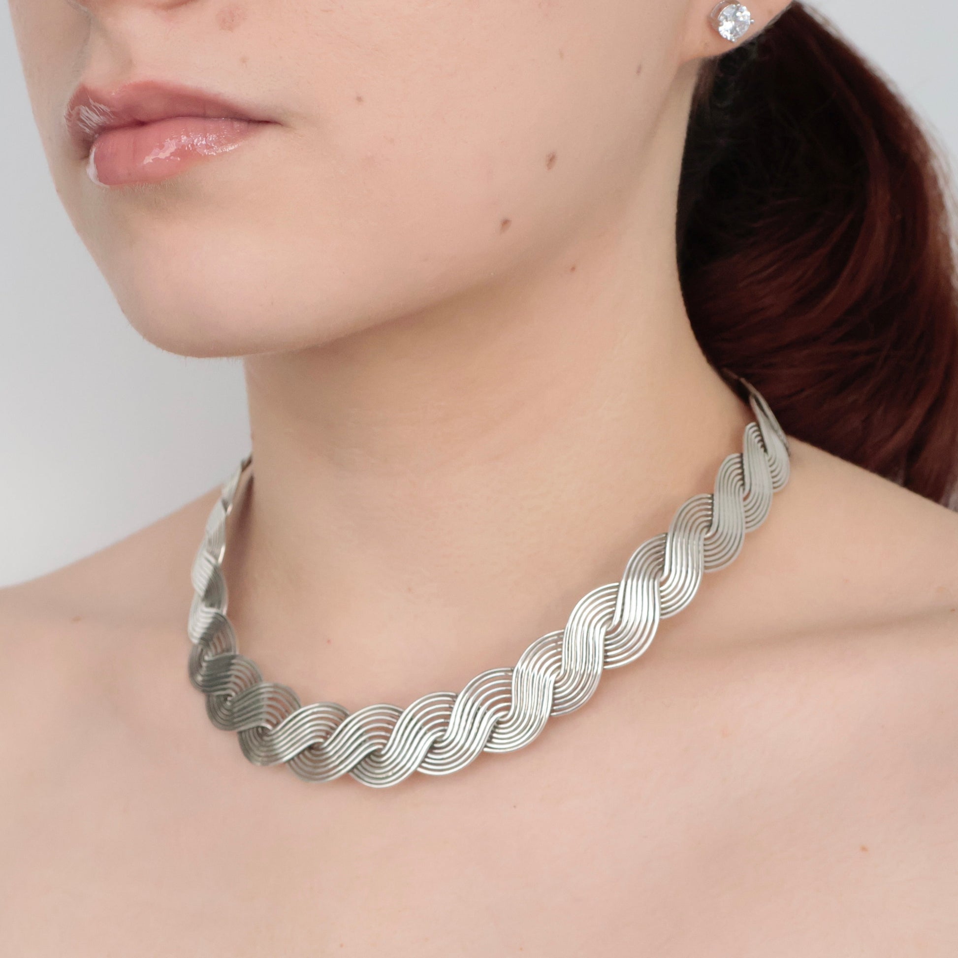 Sterling Silver Hand woven Neck Hoop. Oxidized to show detail. Open in back.